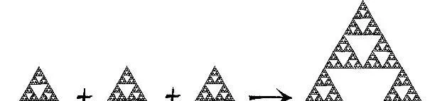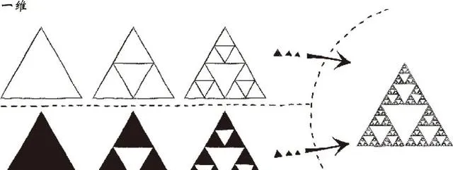 雖然這兩條路徑處在不同的維度中,但它們的終點是相同的!經過無數個步驟之後,兩條路徑都構造出了謝爾賓斯基三角形。因此,這個圖形在維度上具有絕對的模糊性。謝爾賓斯基三角形是一維的還是二維的?它是透過第一條路徑堆積起來的線變成了面,還是透過第二條路徑被挖空的面變成了線?