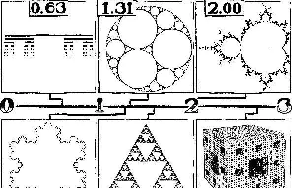 就像佩亞諾曲線,這些線條的扭曲程度如此之大,以至於不能再被視為是一種普通的線。它們就像謝爾賓斯基三角形,還沒有迂回纏繞成一個面,而是介於兩者之間。對這些線,我們無法像對長度那樣以米(m1)來測量,也無法像對面積那樣以平方米(m2)來測量,而是應該根據 1.25 維圖形的特定量度單位來測量:「1.25 次方米」(m1.25)。